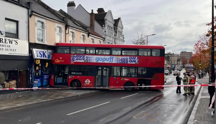 A bus slammed into a business near a train station in east London.