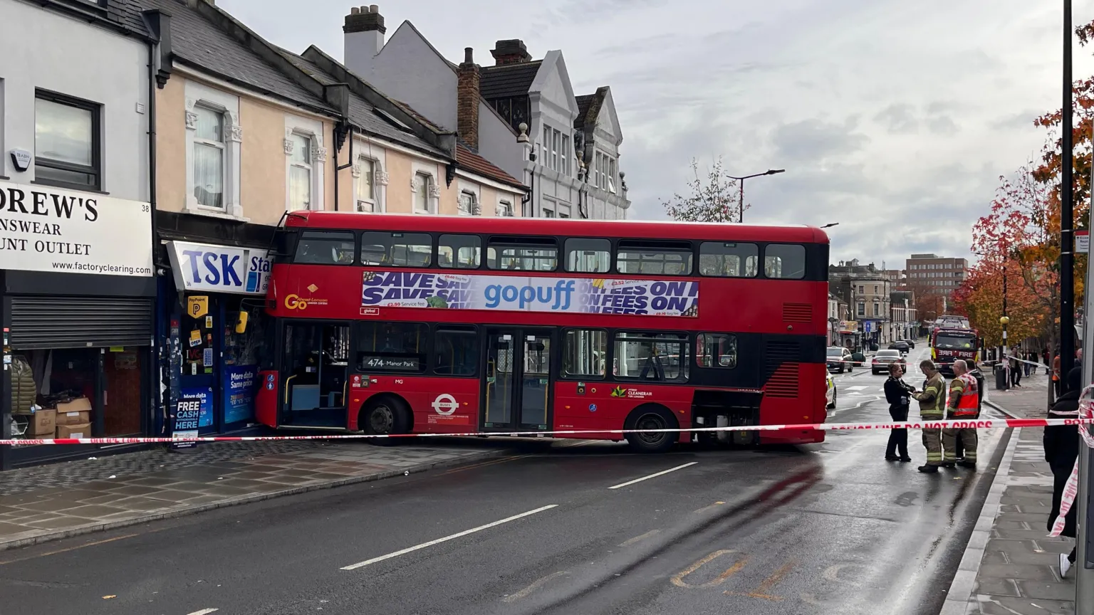 At around 09:00 GMT, emergency personnel were summoned to Station Road near Manor Park Station, where they discovered a double-decker bus that had smashed into a shop.