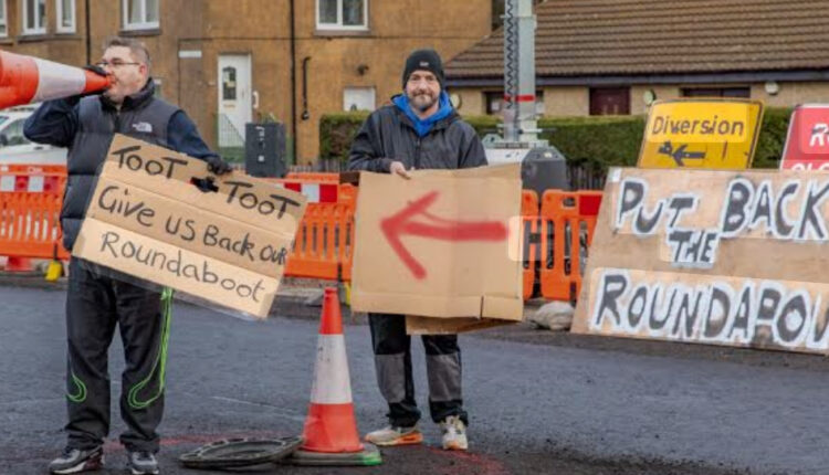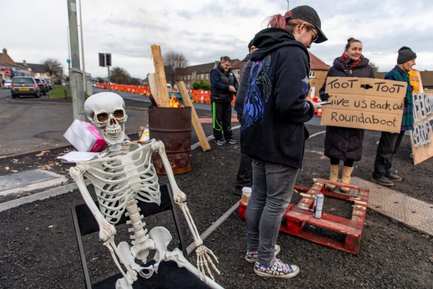 Protests will continue, they claim, until Fife Council agrees to reconstruct the Toll Bar roundabout, which was dismantled as part of the £4 million active travel initiative.